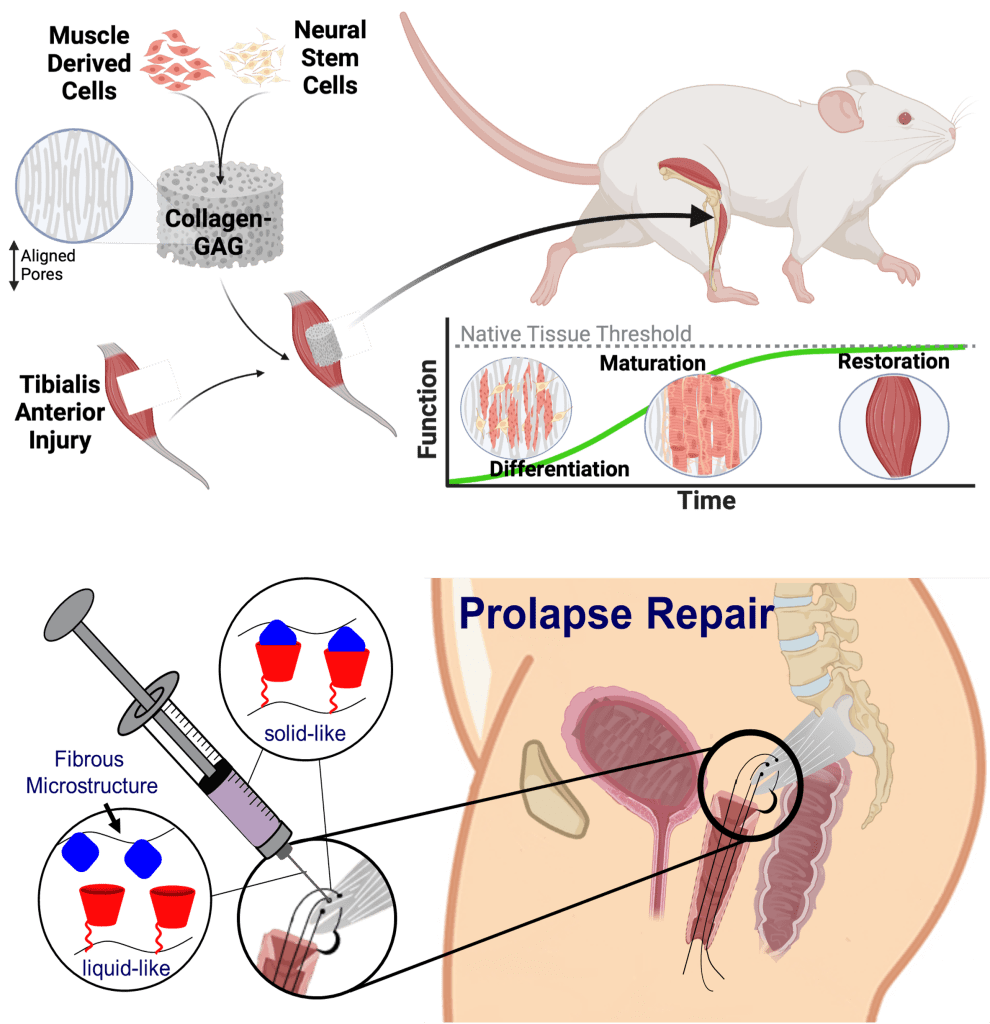 Our tissue engineering efforts focus on two distinct challenges: 1) the traumatic destruction of muscle mass/function through volumetric muscle loss, and 2) pelvic organ prolapse, which affects approximately 50% of women who have given birth. We address these challenges through a range of approaches combining novel biomaterial technologies (e.g., conductive scaffolds, injectable nano/microfibrous materials), animal models, and clinical collaborations.
